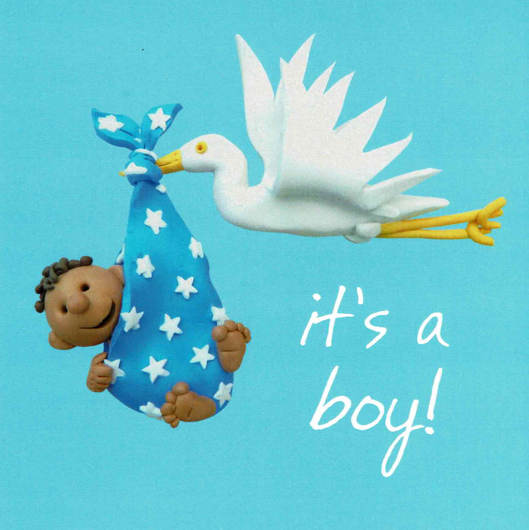 A simple blue card with image of baby boy and white writing