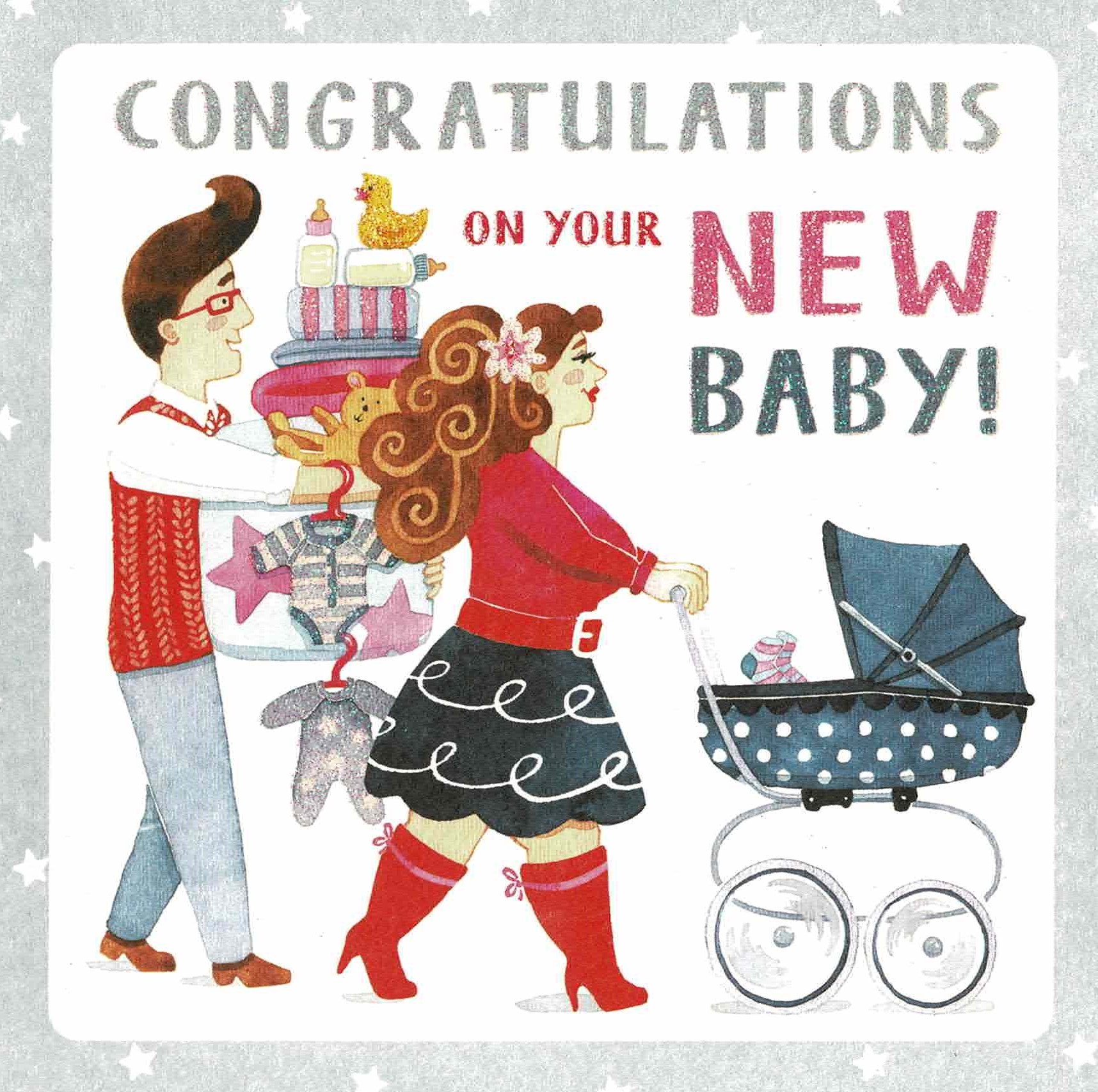 A family walking with presents and a pram. Embellished with glitter.