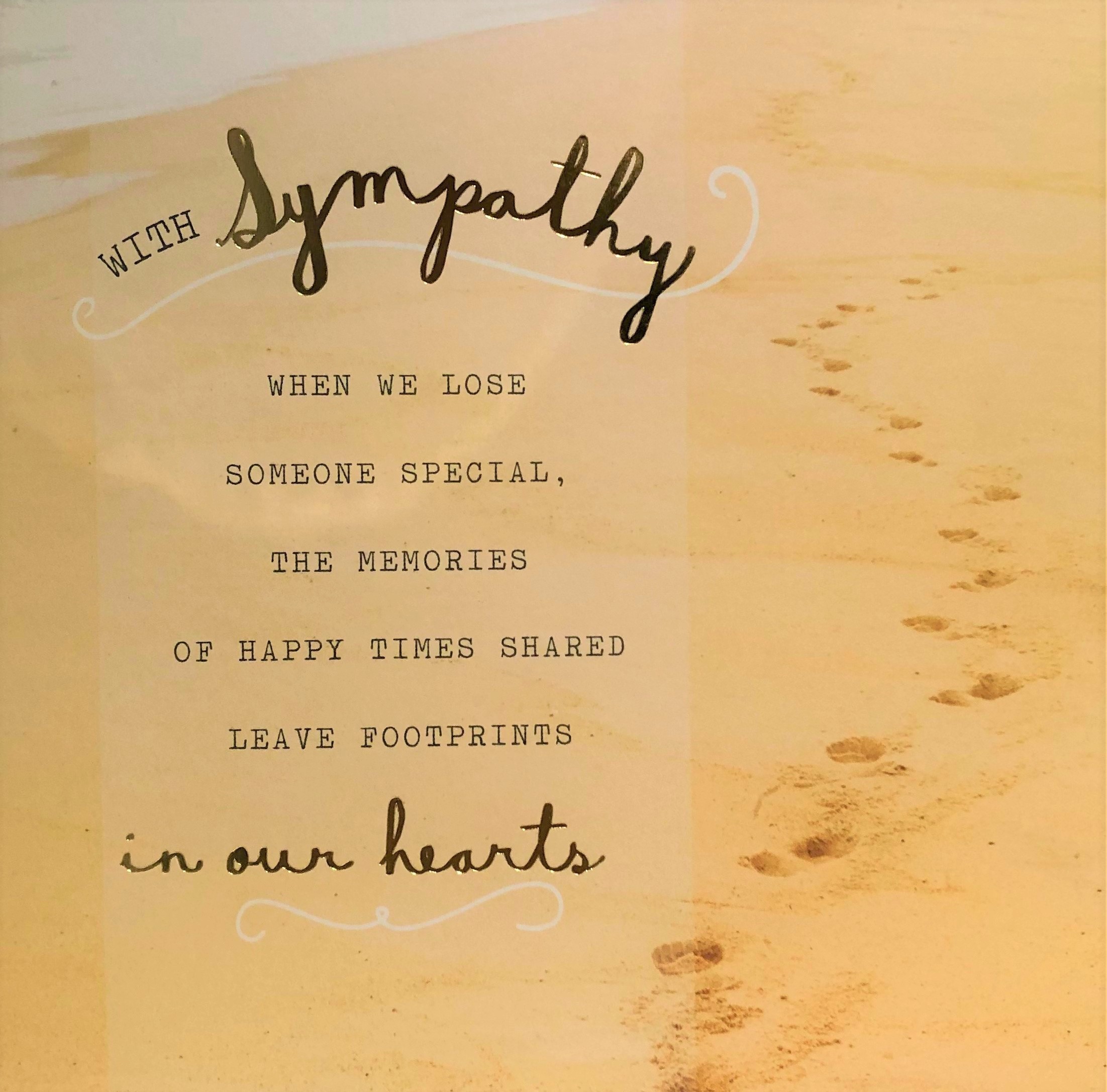 A beautiful beige coloured card with a sand theme and gold writing