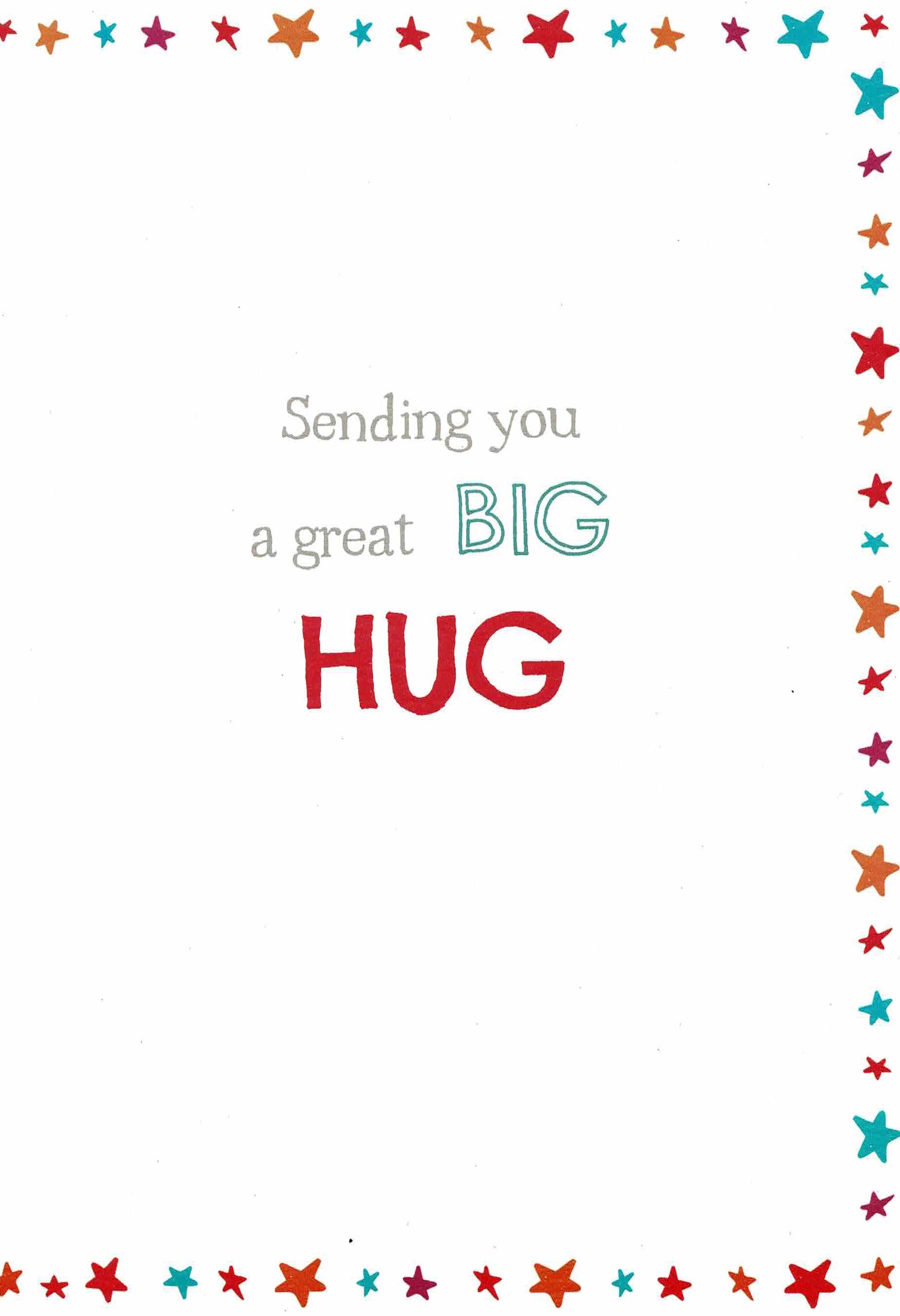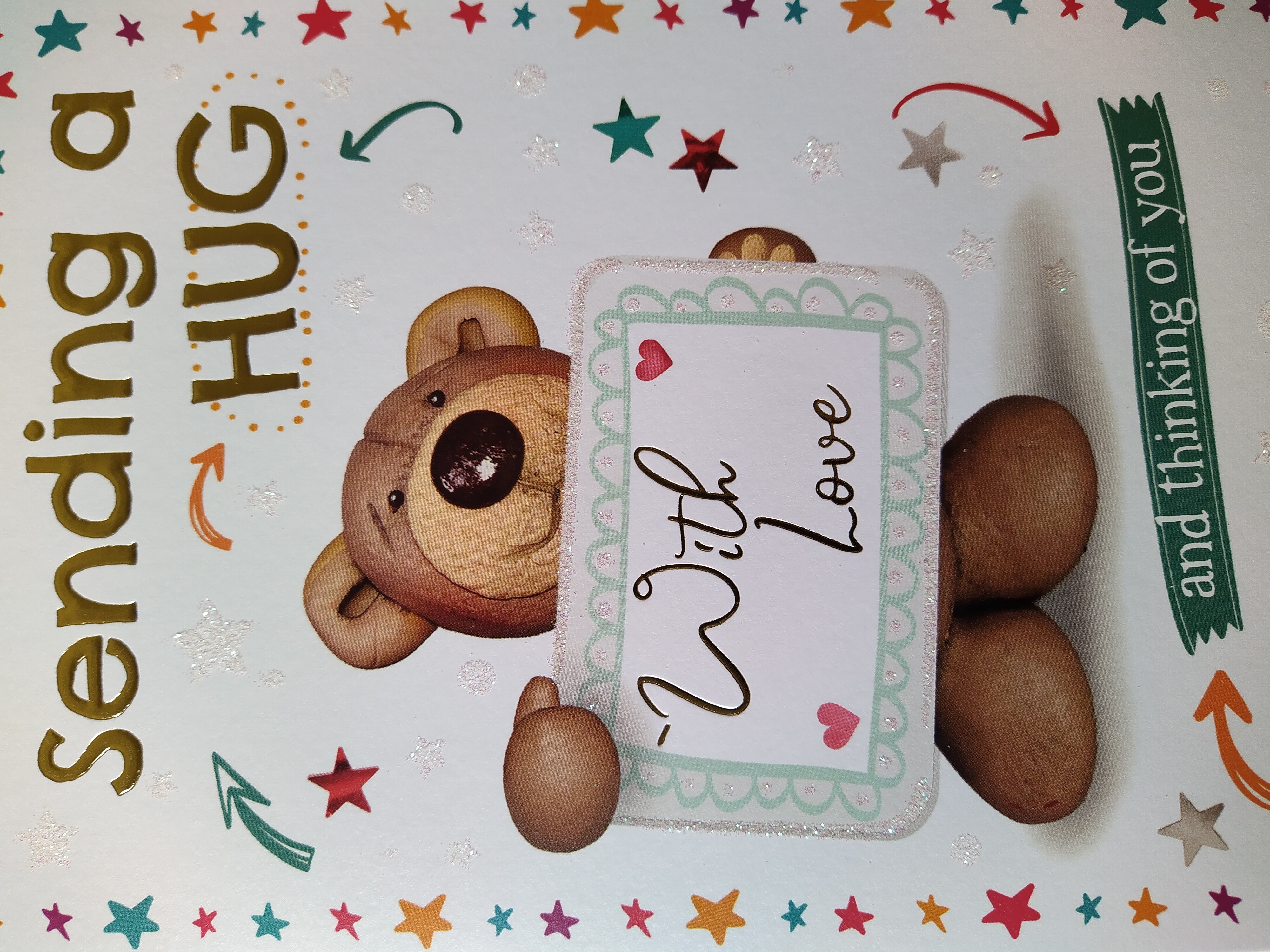 A glittery, simple, thinking of you card with a cute teddy bear.
